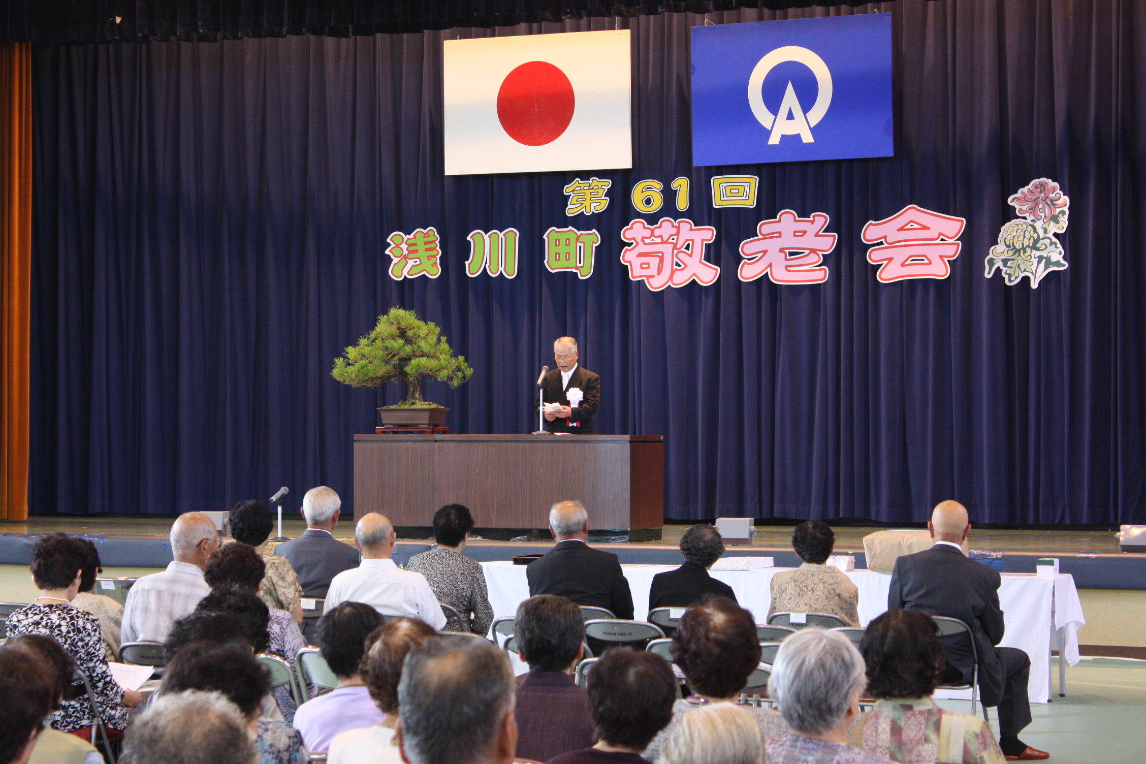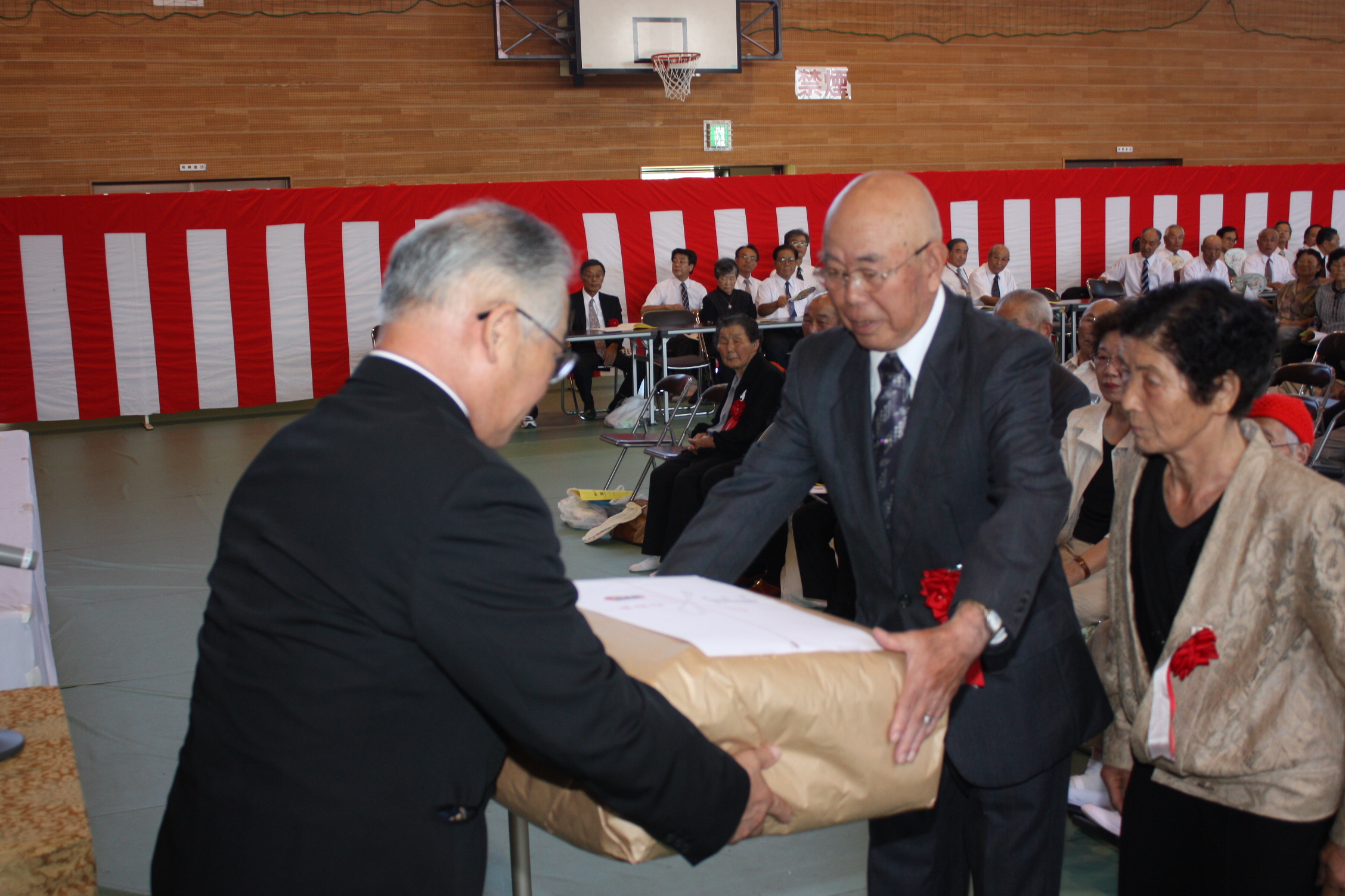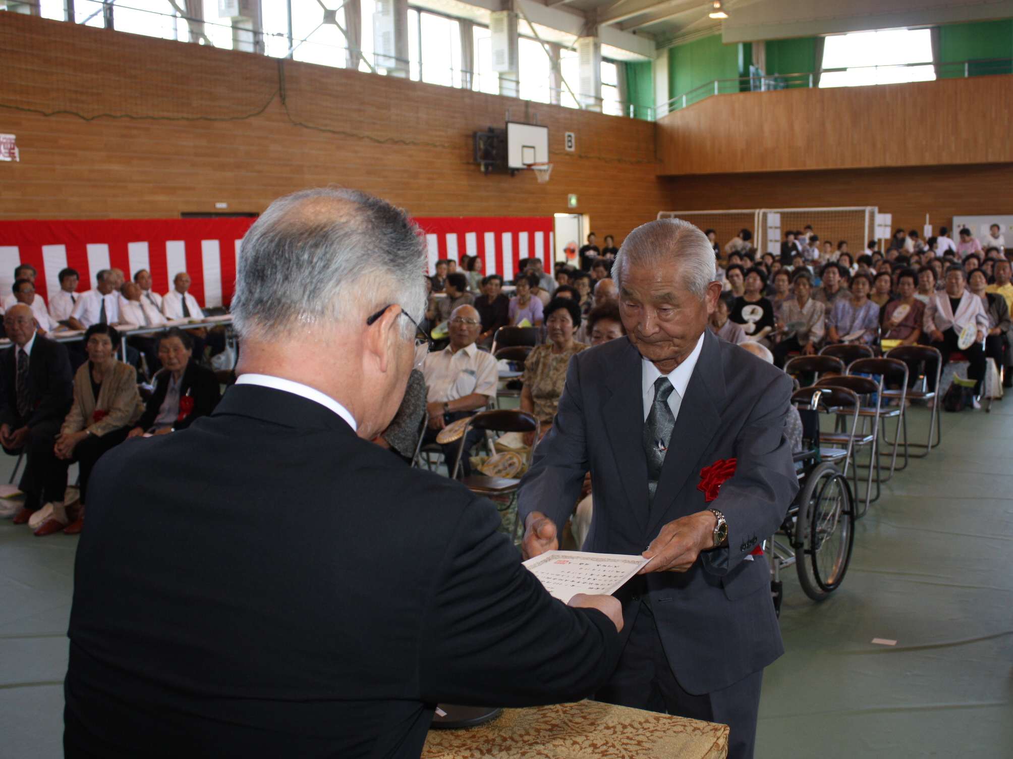 今年の9月16日までに75歳以上となる方 938名 が招待され、式典において須藤町長や来賓の方々から長寿を祝うあいさつがあり、その後、様々な祝いの品が贈られました。