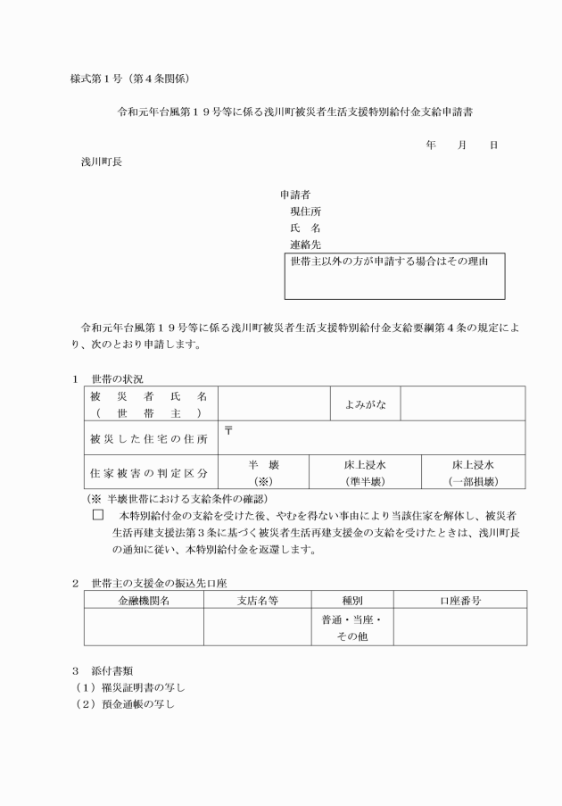 第4条 被災世帯となった世帯の世帯主は,特別給付金の支給を受けようとする場合は,別記支給申請書(様式第1号)に関係書類を添えて,町長に提出しなければならない。